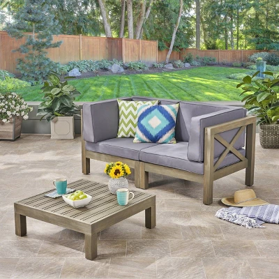 Featuring cross-back acacia wood frames and weather-resistant outdoor cushioning, this Christopher Knight Home Brava 3pc Acacia Modular Loveseat and Table Set will add a luxe, resort-like flair to any outdoor living area it finds itself a part of. Two single-armed components come included, one for the left side and one for the right, forming a seating arrangement comparable to a conventional loveseat when joined at their unarmed ends; they share a stylish and slatted square coffee table, also composed of 100% acacia. The set is completely configurable, able to round out any outdoor living area, whether together, apart, or as an accompaniment to a larger ensemble of sectional outdoor furniture. For the patio, deck, porch, or yard of modest proportion.