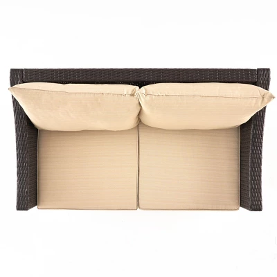 This wicker loveseat and table are a great addition to any patio. The water resistant cushions in conjunction with the wicker make both the loveseat and table ideal for an outdoor setting. The slight curve of the arms adds the perfect amount of flair, giving you a stylish and comfortable loveseat and table for your patio.