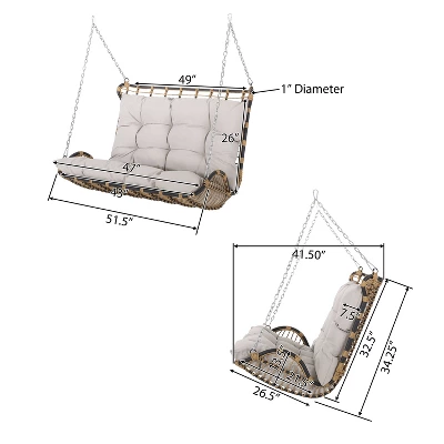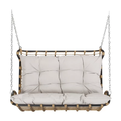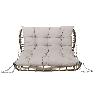 Enjoy the serenity of the great outdoors with soothing rocking motions. With a durable powder-coated iron frame and beautiful wicker-wrapped design, our hanging porch swing offers any garden or deck a calm space for you and your family to unwind. Completed with plush water-resistant cushions, this swing not only enlivens your soul but also your outdoor space with a boho-inspired aesthetic. Whether you are enjoying the summer sun or cuddling up with a loved one, this porch swing has you covered.