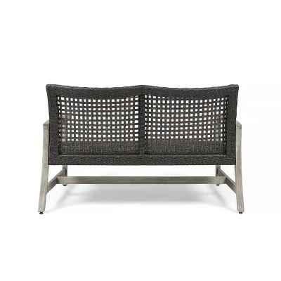 - ACACIA WOOD WITH COMPLEMENTING FINISH: This frame consists of an acacia hardwood that accents the wicker seat. This material is washed with a complementing finish and maintains a sturdy foundation for the sofa that can withstand most weather conditions.