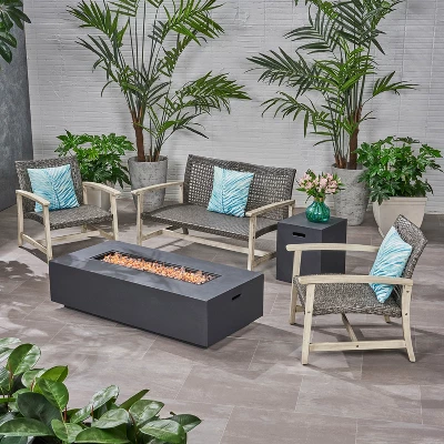 Instantly transform your outdoor space with a perfect blend of functionality and comfort with our chat set with a fire pit centerpiece. Offering cozy nights around the fire, this set is perfect for accommodating guests while maintaining a durable structure with its naturally durable acacia wood frame. This comes with two chairs, one loveseat, a fire pit, and a tank holder that you can arrange however you please. This extremely versatile set is perfect for those who love to make things their own.