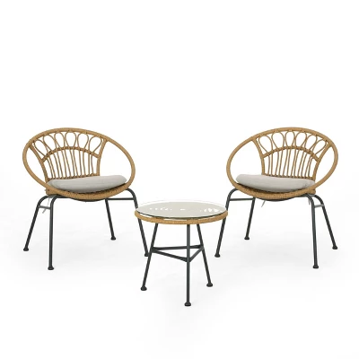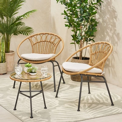 Settle back under the sun with a chilled glass of lemonade and good company. Our chat set perfectly blends faux rattan and metal to emphasize its superior excellence and to bring your outdoor space together with a flourish. This set features thin angled frames and tempered glass, providing a stylish flair to your outdoor space while offering a minimalistic yet durable structure. With a wrapped rattan design and cozy basket shape chairs, this set brings a modern twist to a boho look, making this ideal for any style of decor.