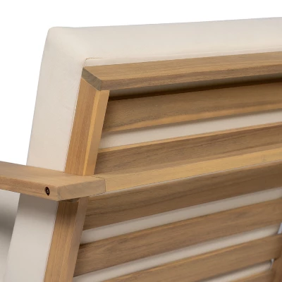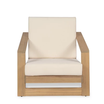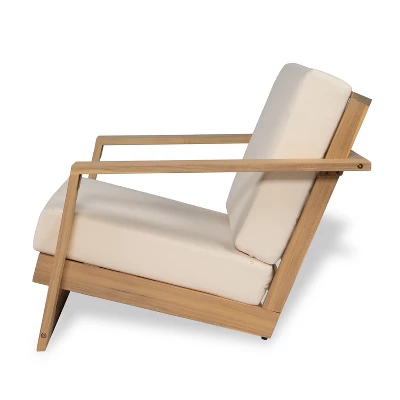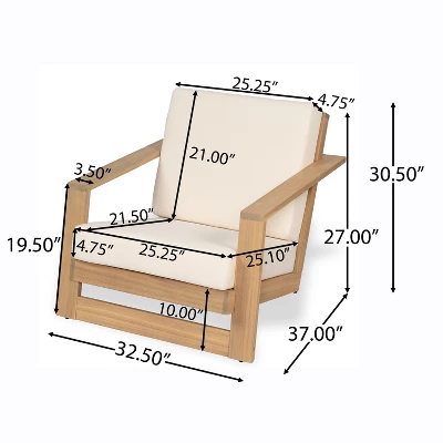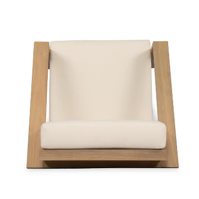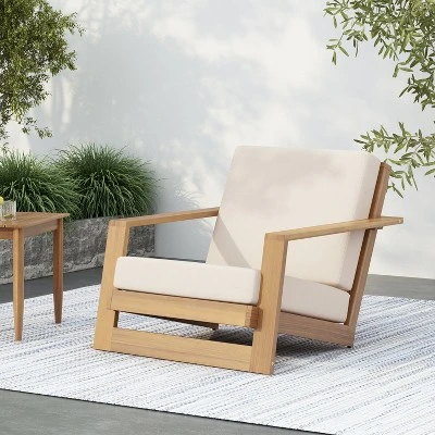 Bring a touch of modern style and comfort to your outdoor space with this acacia wood accent chair. Featuring deep, angled seating and wide armrests, it’s designed for total relaxation. The solid acacia wood frame provides long-lasting durability and a natural aesthetic, while the strong structure supports up to 400 lbs. Ideal for patios, porches, or poolside use, this chair offers both style and substance. Easy to assemble with included tools and instructions, it’s a perfect upgrade for any outdoor setting.