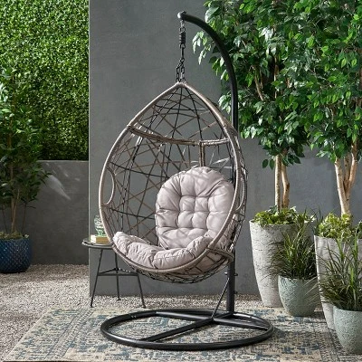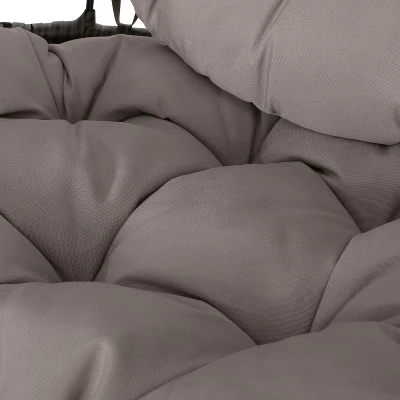 Add a unique touch to your backyard or patio space with this charming and fun hanging chair. Built from thick meshed wicker, this chair will have you cradled and hanging in comfort as you enjoy the refreshing breeze of the great outdoors. This is complete with side handles to help you get in and out of the chair and also includes plush cushions for extra coziness. From summer lounging to stretching out with a good book, this hanging basket chair will have you relaxing with ease.