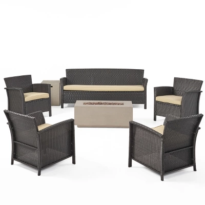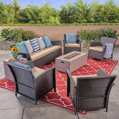 - DIMENSIONS: Choose an accessory that is the perfect size for you and your furniture. Each club chair is 28.50″ W x 28.50″ D x 30.30″ H, the sofa is 73.25″ W x 28.75″ D x 31.25″ H ,the fire pit is 40.25″ W x 19.00″ D x 15.00″ H, and the tank holder is 16.25″ W x 16.25″ D x 20.25″ H. You will love how much your space can transform with the simple addition of this fire pit chat set.