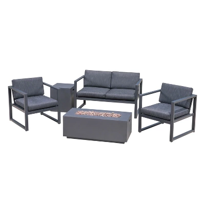 This aluminum framed chat set with fire table is the perfect addition to any patio or backyard. Complete with a loveseat two club chairs, one fire table and companion tank hold, this set has it all. With plush cushions for comfort and the fire table for warmth, this set is sure to be a fan favorite amongst your friends and family.