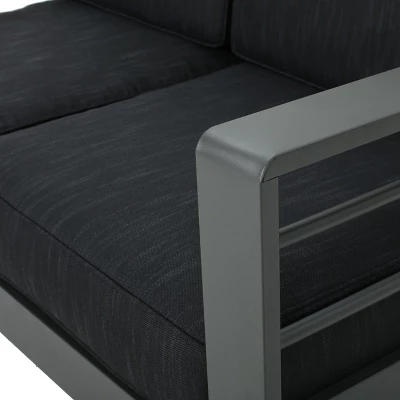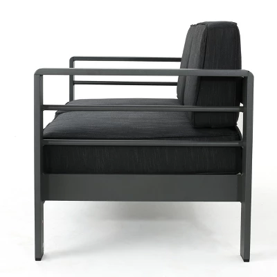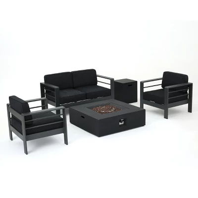 This chat set features two club chairs, a love seat, and a wonderfully warm fire table for you to enjoy all year long. Made with top quality aluminum, each of the chairs and loveseat feature both comfort and quality craftsmanship. The fire table is made with magnesium oxide to provide superior quality and performance. This set will have you spending your days and nights outside enjoying the freedom of your backyard.