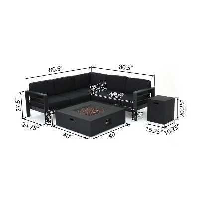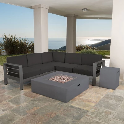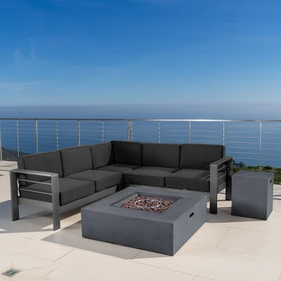 Stay warm by the fire and have comfortable outdoor seating all within one complete purchase. Featuring seating for 5 and a stylish gas fire table as your center piece, you will love hosting outdoors all summer long.