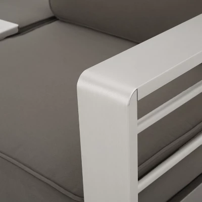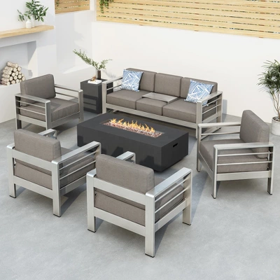 Enjoy sitting around the fire with your family and friends with this seating and fire table set. Complete with four club chairs, a three seater loveseat, and fire table. The club chairs and love seat feature a top quality aluminum frame that has been treated to withstand the elements and extra plush water resistant fabric cushions for maximum comfort. The fire table is made with sturdy magnesium oxide to last you for years to come.