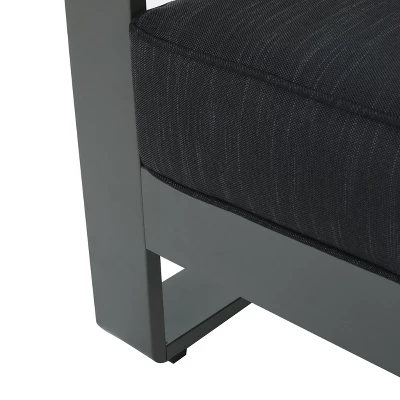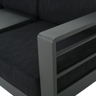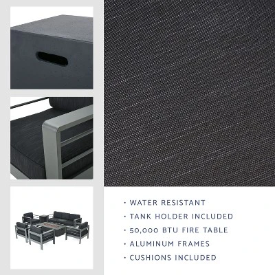 Enjoy sitting around the fire with your family and friends with this seating and fire table set. Complete with four club chairs, a three seater loveseat, and fire table. The club chairs and love seat feature a top quality aluminum frame that has been treated to withstand the elements and extra plush water resistant fabric cushions for maximum comfort. The fire table is made with sturdy magnesium oxide to last you for years to come.