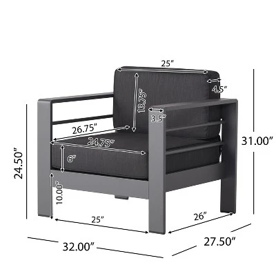 - DIMENSIONS: Choose an accessory that is the perfect size for you and your furniture. Each club chair is 31.90” W x 27.50” D x 31.00” H, the 3-seater sofa is 76.50” W x 27.50” D x 24.50” H, the fire pit is 56.00” W x 26.00” D x 15.00” H, and the tank holder is 16.25” W x 16.25” D x 20.25” H. You will love how much your space can transform with the simple addition of this charming set.