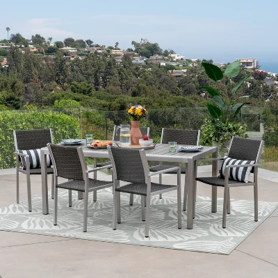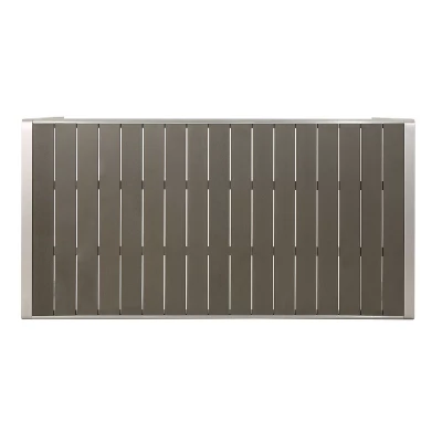 - MODERN SLATTED FAUX WOOD TABLETOP: The table features a contemporary slatted top in a gray faux wood finish that delivers natural warmth without the upkeep. It complements the silver frame for a polished, cohesive outdoor dining look.
