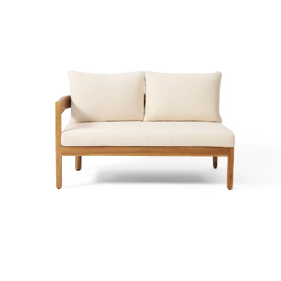 This sectional sofa is crafted from durable acacia wood, offering natural elegance and long-lasting strength against outdoor elements. Its rounded tuxedo design features smooth curves with a backrest seamlessly flowing into armrests, adding refinement to any patio. The slat design enhances visual appeal with open paneling that blends classic charm and modern style. Thick, foam-padded water-resistant cushions ensure comfort and easy cleaning, while removable covers make upkeep simple.