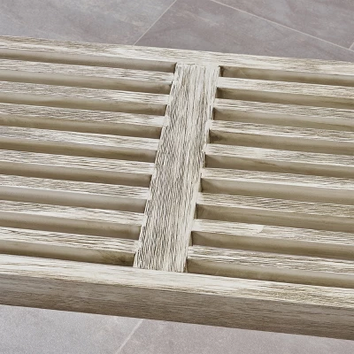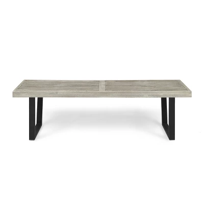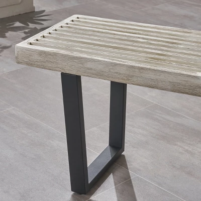 An extra couple of seats on the patio or deck never hurt anybody. Our outdoor dining bench will charm your guests right off of their feet, greeting them warmly with its attractive and homey appeal. Crafted from a combination of hearty, rich acacia wood and chic, powder-coated metal sled legs, this piece reels in a look that is both modern industrial and wonderfully rustic. Finished with a gorgeous slat panel look, our bench pairs seamlessly with a variety of table options.