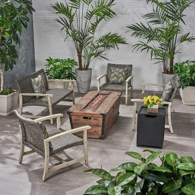 Keep warm with your friends and family using this delightfully rustic chat set. This comes with two club chairs, two loveseats, a firepit, and a tank holder for you that you can arrange however you please. This extremely versatile set is perfect for those who love to make things their own.