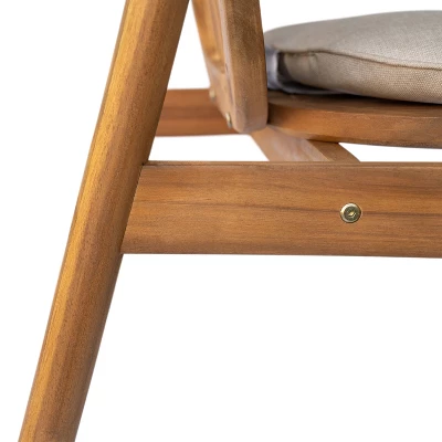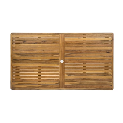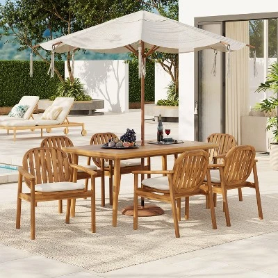 Crafted from premium solid acacia wood, this outdoor dining set offers exceptional durability and natural resistance to weather, making it ideal for year-round use. Its rustic charm is highlighted by a warm, natural wood finish and timeless silhouette that blends seamlessly with farmhouse or countryside decor. The classic slatted tabletop and chair backs not only enhance airflow and drainage but also elevate its functional elegance. Smoothly curved armrests and padded seat cushions provide ergonomic support and comfort, creating an inviting space for outdoor meals, gatherings, or peaceful relaxation.
