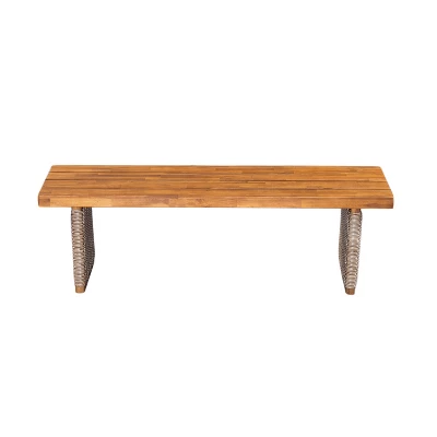 Upgrade your outdoor seating with this acacia wood patio bench, crafted for style and durability. Featuring a classic slatted seat and handwoven rattan legs, it blends rustic charm with artisan flair. Ideal for mild weather use, it offers sturdy support for al fresco dining, casual lounging, or social gatherings. Easy to assemble and built to last, this bench is a versatile staple for your patio, garden, or deck.