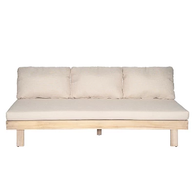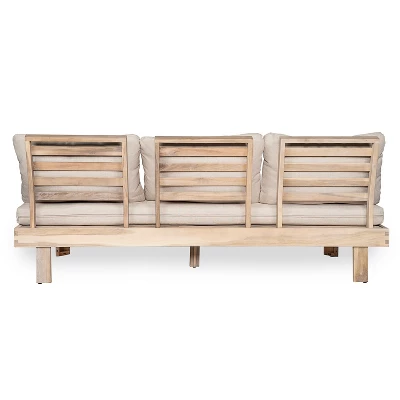 Enhance your patio or backyard with the outdoor acacia wood 3-seater sofa, a perfect blend of durability, comfort, and modern style. Crafted from solid acacia wood, this outdoor armless sofa offers natural beauty, exceptional resilience, and a sturdy foundation for long-lasting use. The spacious 3-seater patio sofa comes with thick, foam-padded cushions upholstered in water-resistant polyester fabric, ensuring comfort and reliability in outdoor settings. With removable cushion covers, cleaning is simple and convenient. Designed for versatility, this patio sofa fits seamlessly into outdoor decks, gardens, or covered porches. Easy to assemble and weather-resistant, it’s an essential upgrade to your outdoor living space.