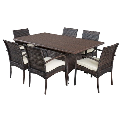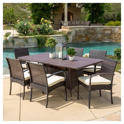 Relish the outdoors with a set just as unique as your outdoor patio with the Christopher Knight Home Rudolph 7-piece Wicker Patio Dining Set with Cushions. This set offers a solid foundation of metal and resin wicker. Creates a look that is not only trendy but functional. The large size can accommodate the larger of parties. Whether you are entertaining guests or simply enjoying the outdoors the Christopher Knight Home Rudolph 7-piece Wicker Patio Dining Set with Cushions will satisfy for years to come.
