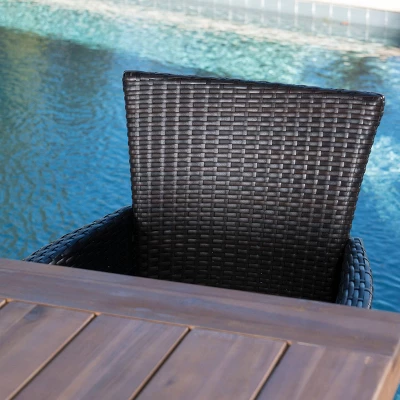 This clean and simple Christopher Knight Home Torrens 7pc Acacia Wood and Wicker Dining Set combines the functionality of wood and iron with the comfort of wicker. Complete with a table and six wicker dining chairs, this set offers comfortable seating in the great outdoors. Sure to complement any patio décor, this Christopher Knight Home Torrens 7pc Acacia Wood and Wicker Dining Set offers you a stylish wooden design with the functionality of an iron framework and comfortable wicker chairs, guaranteed to give you a weather resistant set that will last your for years to come.